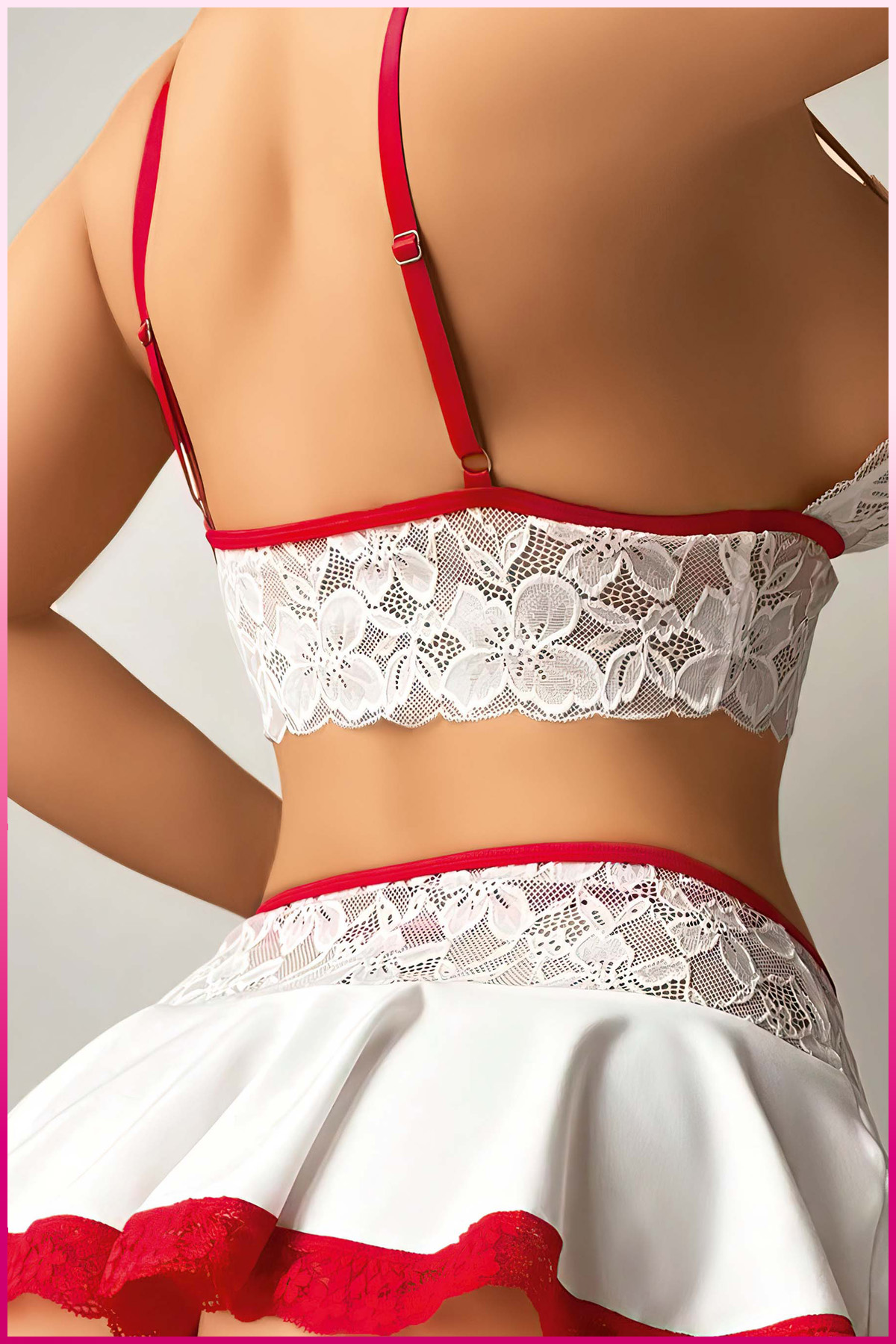 Minirok met ruches: Deze korte rok met transparante witte kanten details zorgt voor een levendige en verleidelijke look.